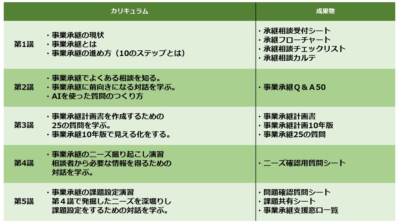 専門的なことが多い事業承継において、豊富な事例と対話支援に焦点を当てているので、カリキュラムがわかりやすいです。